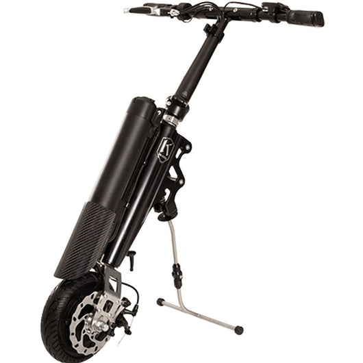 The Klaxon Klick Electric Mini Carbon is light and easy to handle, the base model Klick Electric weighing in at only 7.9kg without the 5.8Ah 36v Lithium battery. It can handle a journey of up to 25km on a single charge, depending on terrain, speed and land relief. It is highly adaptable with a convenient kickstand for when not in use. The 8″ inch wheel makes for a fun ride, overcoming everyday obstacles and able to handle rough terrain.