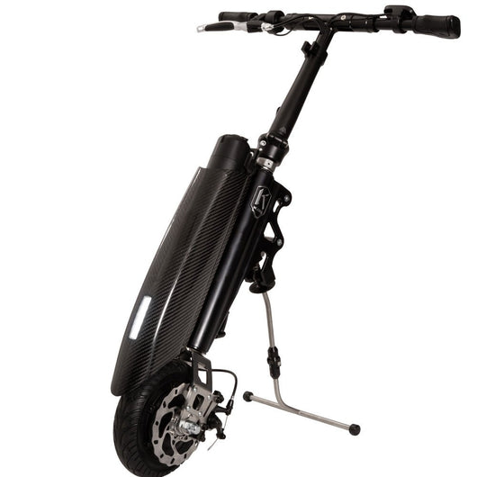 The Klaxon Klick Electric Mini Carbon is light and easy to handle, the base model Klick Electric weighing in at only 7.9kg without the 5.8Ah 36v Lithium battery. It can handle a journey of up to 25km on a single charge, depending on terrain, speed and land relief. It is highly adaptable with a convenient kickstand for when not in use. The 8″ inch wheel makes for a fun ride, overcoming everyday obstacles and able to handle rough terrain.
