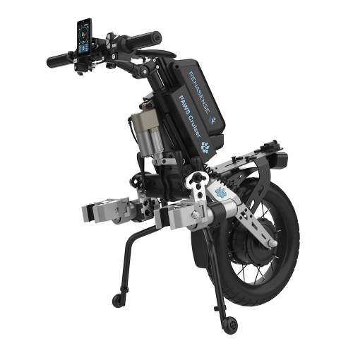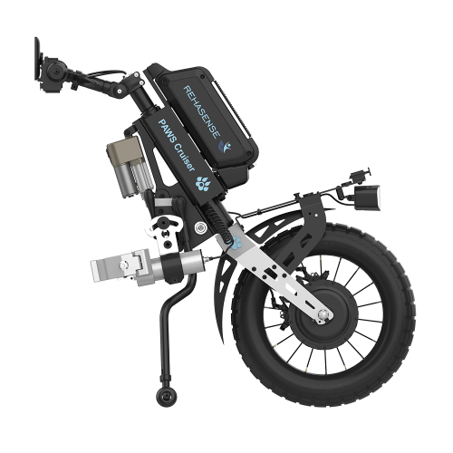 The Rehasense PAWS Cruiser 16" is a powerful and versatile power add-on designed to transform your manual wheelchair into an all-terrain mobility solution. With its 16-inch drive wheel and manual or auto clamp and lift system, the Cruiser 16" offers a smooth and comfortable ride on various terrains, from city streets to forest trails. This device is ideal for active wheelchair users seeking enhanced independence and the ability to travel longer distances with ease.