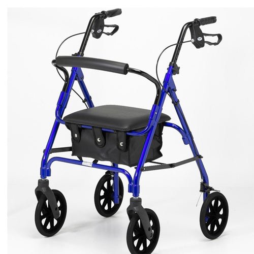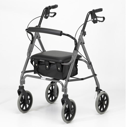 The Days lightweight Aluminium rollator 102 is only 6kg and is available in a choice of colours.The walker comes with lockable brakes which makes the walker easy to secure when you have stopped or need to sit down on the walker. Under the seat there is a storage bag to hold your possessions. The handles are comfortable ergonomic hand grips and are adjustable in height from 75cm to 87cm. Folds away flat for easy storage.