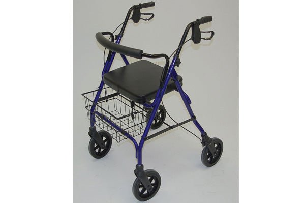 The Days heavy duty rollator 110 weighs 12.3kg and is available in Blue. This walker is made of heavier gauge steel tubing and has an extra wide padded rest seat. The walker comes with lockable brakes which makes the walker easy to secure when you have stopped or need to sit down on the walker. At the front of the walker there is a basket to hold your possessions. The handles are comfortable ergonomic hand grips and are adjustable in height from 83cm to 94cm. The seat height measures 55cm. Folds away flat for easy storage.